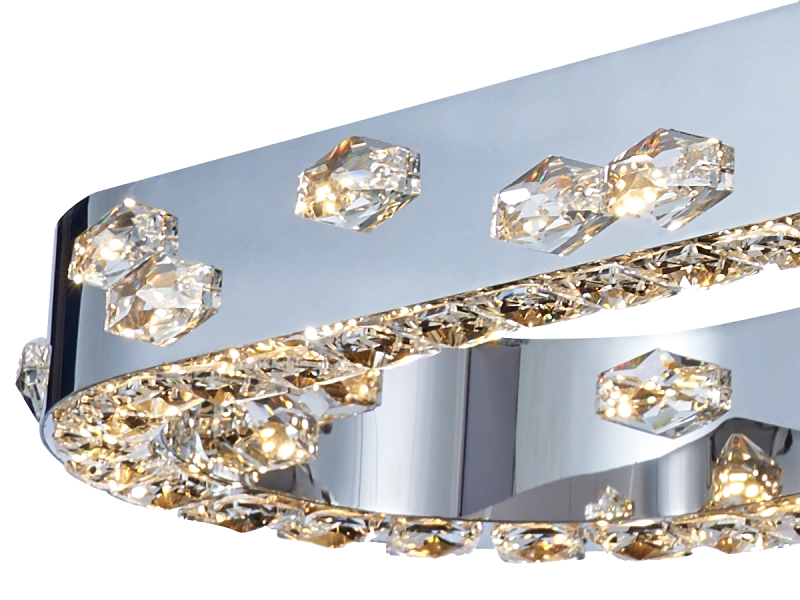 Svietidlo je vyrobené z vysokokvalitného nerezového kovu s chrómovou povrchovou úpravou, doplnené o precízne brúsené kryštály, ktoré umocňujú odraz a lom svetla. Použitá technológia spracovania zabezpečuje dlhodobú stabilitu materiálu a zachovanie jeho estetického vzhľadu.