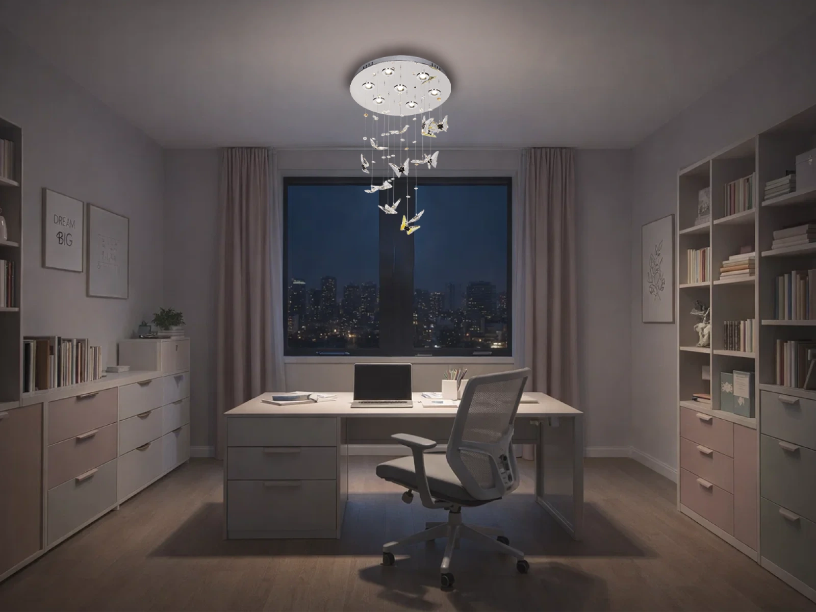 The NEDES LED luminaire with decorative butterfly-shaped elements gives the lighting a playful and original look. The delicately suspended details create an interesting visual effect and pleasantly brighten up the interior.